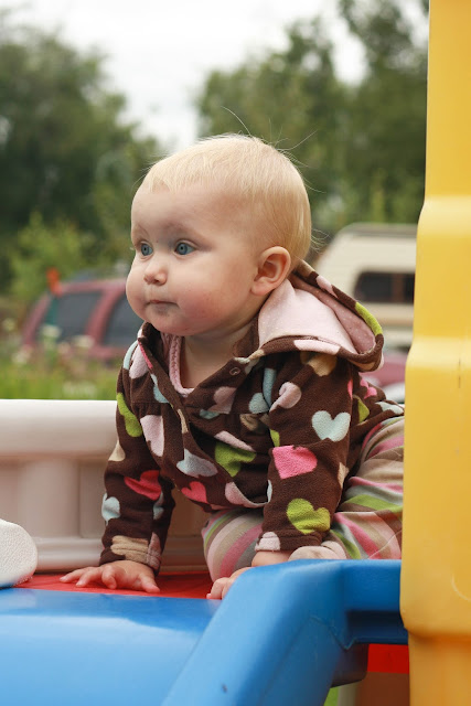 Delia's so funny. She just sits up at the top of the slide for a long time, and it's not like she's afraid to go down..she just likes to hang out up there!